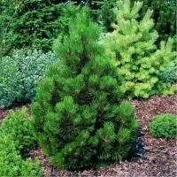 Крона компактная и аккуратная, густая и пушистая. Форма кроны широкопирамидальная или колокольчатая. Ветви густые и симметричные, направленные вверх. Хвоя длинная и колючая, растущая пучками по две штуки в каждом. Окраска хвои изумрудно-зеленая.