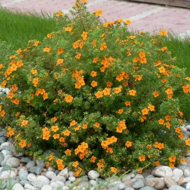 Цветы лапчатки поражают своей элегантностью. Среднего размера цветочки диаметром 2-3 см украшают кустарник с июня до сентября. Окраска этих махровых и полумахровых цветков оранжево-золотистая с красными полосками, что делает их исключительно декоративными и нарядными.