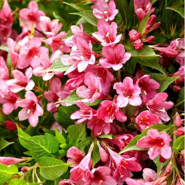 Растение формирует очень плотный, аккуратный куст полусферической формы. В отличие от многих других вейгел, Пикобелла Роза не «разваливается» и сохраняет компактный вид без постоянной формирующей обрезки. Во время пика цветения куст буквально скрывается под массой воронковидных ярко-розовых цветков. Особенность сорта — непрерывное цветение с мая до первых заморозков (октябрь), в то время как большинство классических сортов цветут дважды с заметным перерывом. Листья ярко-зеленые, более мелкие и изящные по сравнению с типичными представителями вида, что делает куст декоративным даже вне периода цветения.