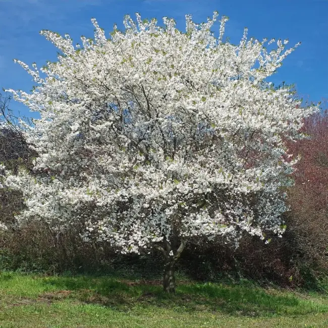 Имеет густую, распростертую или зонтиковидную форму кроны с дугообразными ветвями. Растет медленно, достигая высоты около 3–4 метров и ширины до 3 метров в возрасте 10–20 лет. Уникальность сорта заключается в отсутствии розового пигмента. Бутоны и чашелистики имеют светло-зеленый оттенок, а распустившиеся цветки — чисто-белые, простые, колокольчатой формы (не раскрываются полностью). Листья глубоко зазубренные (надрезанные), что дало название виду. Весной они бледно-зеленые, летом темнеют, а осенью окрашиваются в яркие золотисто-оранжевые и красные тона. После цветения могут завязываться мелкие несъедобные плоды, которые к концу лета становятся темно-красными или почти черными.