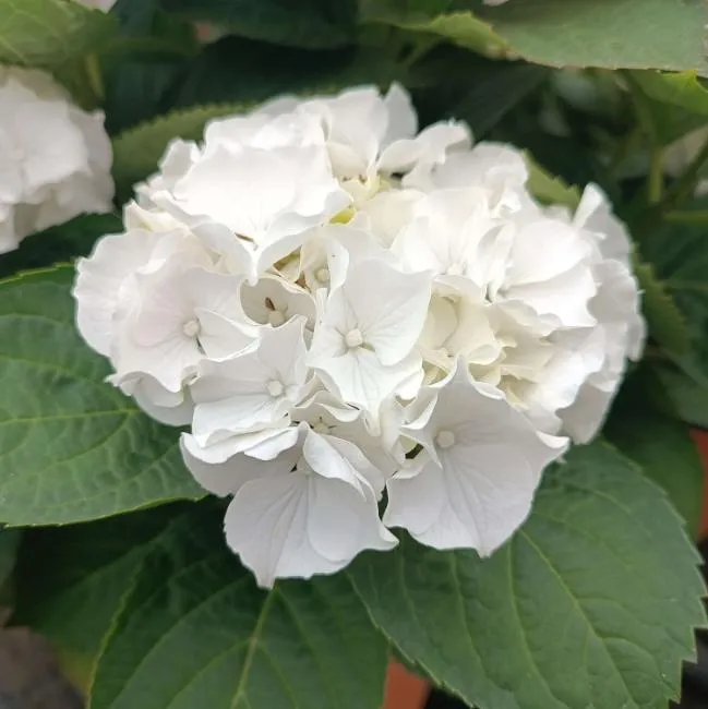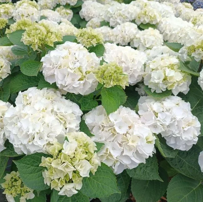Соцветие этой гортензии шаровидной формы, может достигать длины от 16 до 20 см. Основная окраска цветков белая. Цветение начинается в середине лета (обычно в июне) и продолжается до конца лета или начала осени (до сентября). Это ранний период цветения, который длится около 3-4 месяцев.