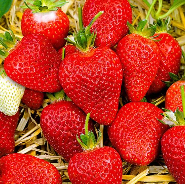 Альба – это средне-крупный гибрид с замечательными, по техническим и вкусовым характеристикам, плодами, цвет ягод — ярко-красный; форма — коническая; размер плодов — средне-крупные; Масса — 25-30 г, вкус сладкий, с лёгкой и приятной кислинкой. Сот обладает средне-выраженным ягодным ароматом с плотно-сочной мякотью.