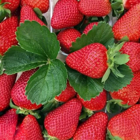 Плотная глянцевая кожица клубники Квики имеет типичный красный цвет и конусовидную, чуть приплюснутую форму. Внутри находятся мелкие желтоватые семена.