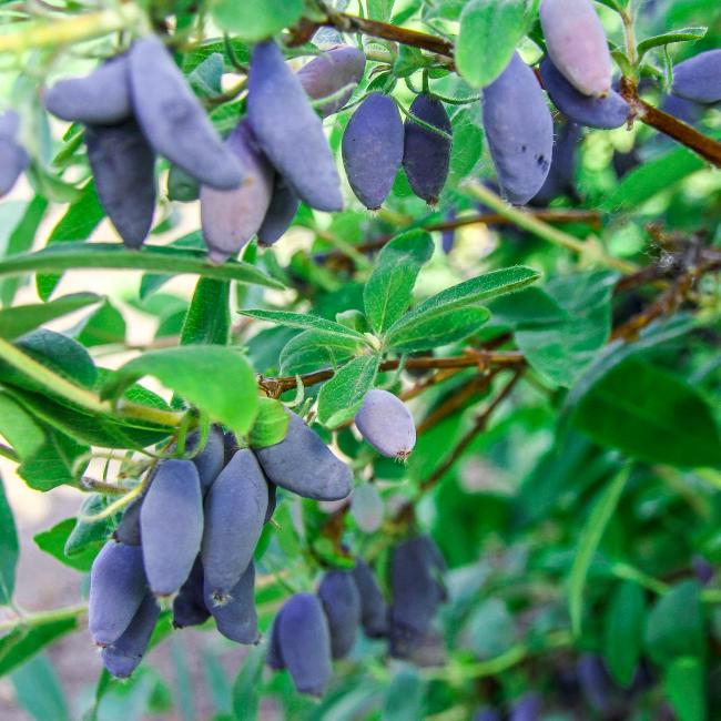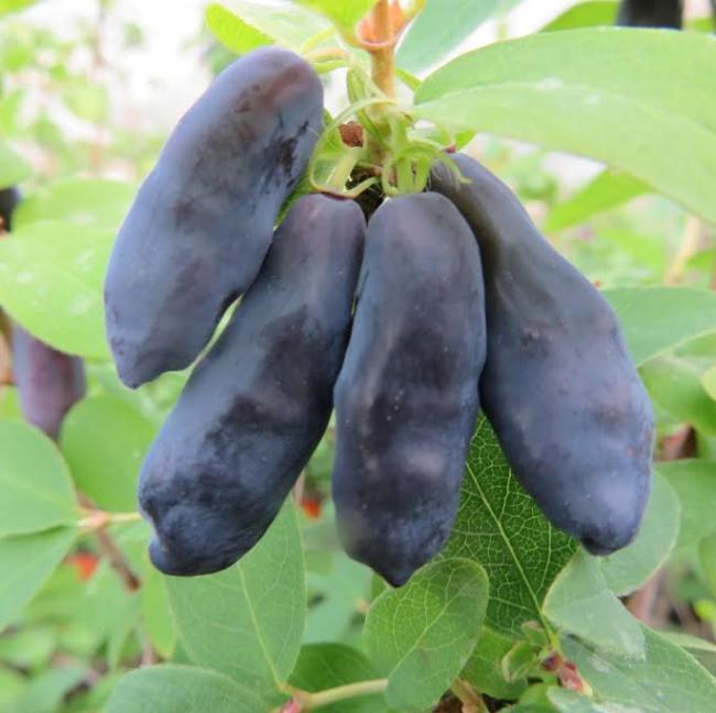 Цветение кустарника довольно раннее. В этот период куст приобретает очень красивый декоративный вид, густо покрываясь средними белоснежными или бледно-желтоватыми цветочками, источающими сладковатый аромат. Эта разновидность жимолости относится к группе очень крупноплодных сортов. На взрослом кустарнике спеют ягодки массой до 4-х граммов и длиной до 3-х см. Форма плодов стандартная – удлиненно-овальная, с заостренными окончаниями. Спелая жимолость имеет красивый фиолетовый окрас, разбавленный выраженным сизым налетом. Кожура у ягоды умеренно-плотная, не жесткая, с заметной бугристостью поверхности. Держатся ягоды на коротких и утолщенных плодоножках, сухо отрываясь во время сбора урожая. Спелые плоды не осыпаются. Собранные ягоды могут переносить транспортировки на небольшие расстояния. Лежкость у плодов средняя, как у большинства съедобных сортов жимолости. Характеризуется широким предназначением – ягоды едят свежими, перерабатывают на джемы, варенье, морсы, замораживают. Кроме того, жимолость (листья, стебли, плоды) применяется в народной медицине. Голубой банан – это один из самых вкусных сортов жимолости. Мякоть у плодов мясистая, плотная, нежная, сочная. Вкус необычный – невероятно сладкий, даже немного приторный, без горечи и приторности. Отменный вкус гармонично сочетается с летним, сладковатым ароматом.
