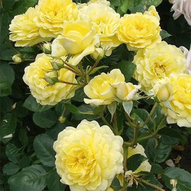 Цветет обильно соцветиями желто-кремовых оттенков по 10-12 цветов на кусте. Цветы средней величины до 10 сантиметров с обилием мелких лепестков. Бутоны уплотненные, симметричные, имеют утонченный аромат. Цветение длительное с ароматом цитрусовых – иногда продолжается все летние месяцы.