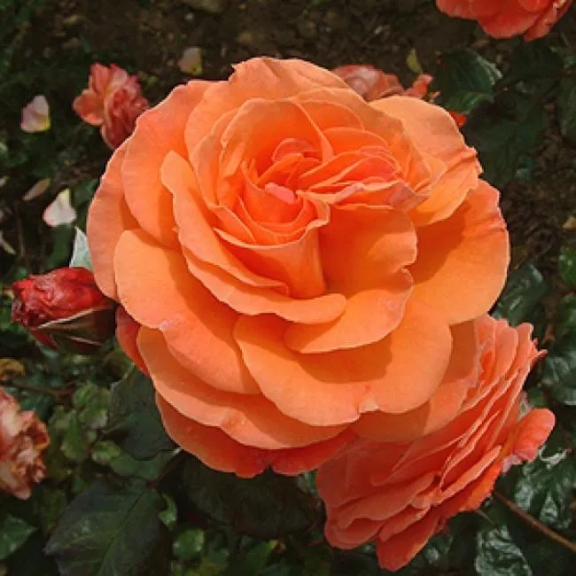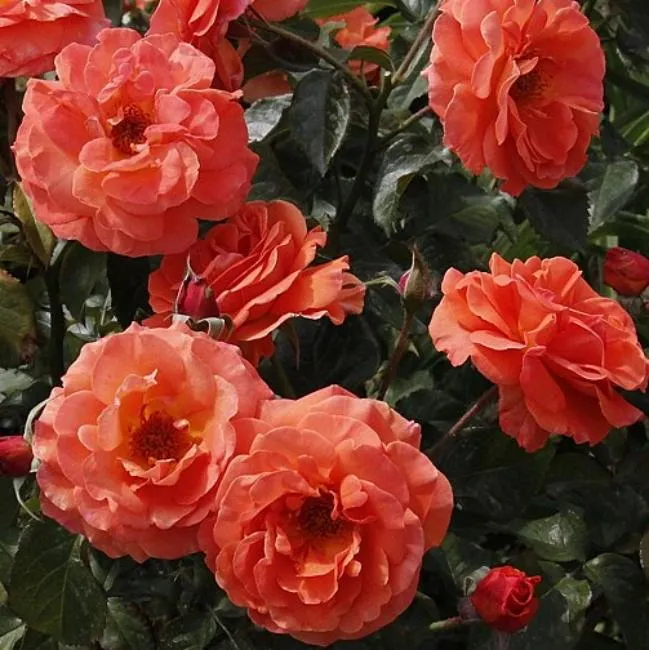 Раскрытый шаровидный цветок обладает довольно большим размером, составляя около 8-10 сантиметров в диаметре. В первый год цветения он является маломахровым, но со следующего сезона данный показатель усиливается. Количество волнистых лепестков варьируется от 26 до 40 штук. Оранжевый цвет бутончиков после раскрытия лепестков может слегка потемнеть до жженого оттенка, а затем выцвести до лососевого. На кусте таким образом могут находиться цветки разных оттенков.