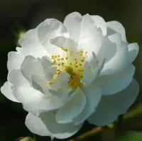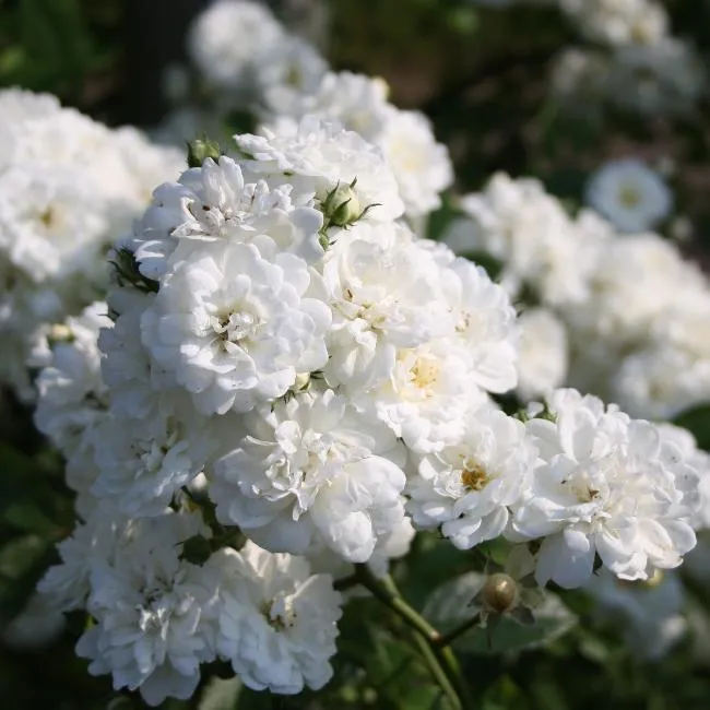 Белоснежные, умеренно махровые цветки собраны в многоцветковые кистеобразные соцветия, насчитывающие от 10 бутонов и более. По всей длине побега взрослого куста обычно расположено более 80 цветков. Плоские по форме, мелкие цветки диаметром 3-4 см насчитывают 20-30 лепестков, украшены ярко-желтой сердцевиной, состоящей из длинных тычинок. Роза обладает приятным интенсивным цветочно-пряным ароматом с едва уловимыми мускусными нотками.