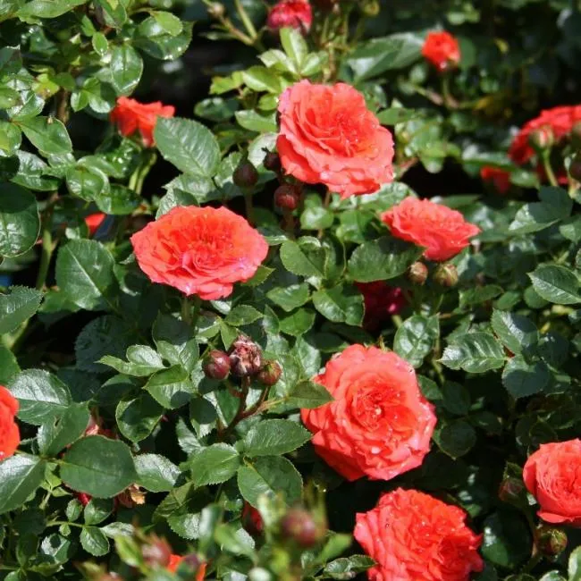 Цветение Оранж Джувел обильное по своей интенсивности. Оно продолжается с июля по сентябрь. Сорт относится к непрерывноцветущим розам.