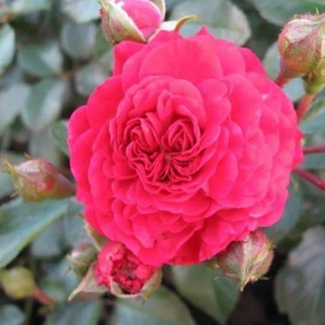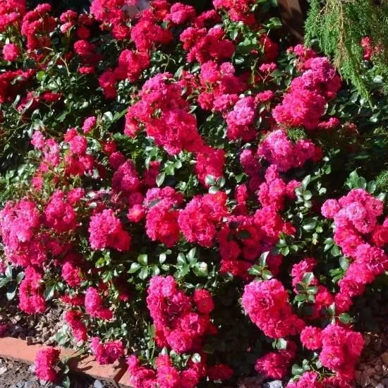 Розы одноцветные, яркие, но не пестрые. Форма – розетковидная. Размеры в диаметре – от 5 до 6 сантиметров. Каждый бутон собран из большого количества лепестков, по 110-120 штук в каждом из них. Розы являются густомахровыми. Растут цветки в соцветиях, а на каждом побеге вырастает от 10 до 15 штук. Дополняет многоцветковые соцветия нежный, но слабый аромат. Строение куста – раскидистое. Растение достигает в высоту около 50 сантиметров, а в ширину – до 90 сантиметров. Листья – темно-зеленые, глянцевые.