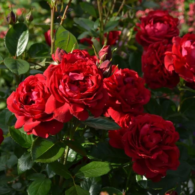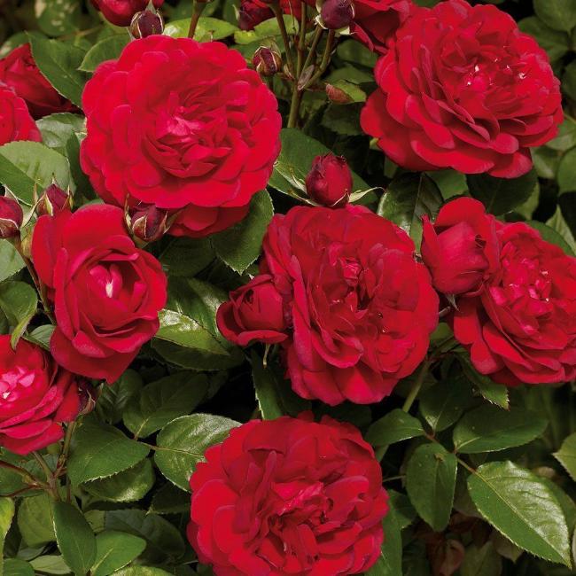В период цветения куст покрывается темно-красными розеткообразными цветками. Иногда в серединке проявляются белые полоски. Цветки густомахрового типа вырастают до 10-15 см в диаметре. Это считается крупным размером роз.