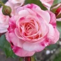 Округло-заостренные бутоны яркого бордово-красного цвета, дополненного кремовыми полосками, плавно перевоплощаются в двухцветные розы чашевидной формы диаметром 7-8 см. Махровые цветы с умеренно-плотной структурой, состоящей из 30-35 лепестков с бархатистым покрытием и волнистыми краями, характеризуются красно-белым окрасом. Распускающаяся роза наделена белыми лепестками с красной каймой, а полностью раскрывшись, на поверхности образуются красноватые штрихи и розовые потеки, что выглядит очень эффектно и необычно. Цветущие кустарники очень эффектны, но практически не издают аромата. Лишь в вечернее время можно уловить легкие сладковатые нотки.