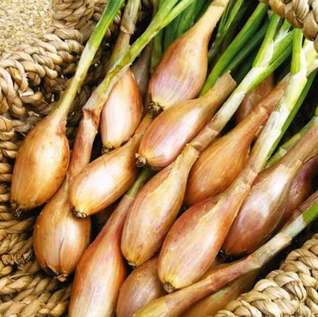 мелкие луковички-севок имеют удлиненную форму, напоминающую шалот, в длину достигают 8-21 мм;