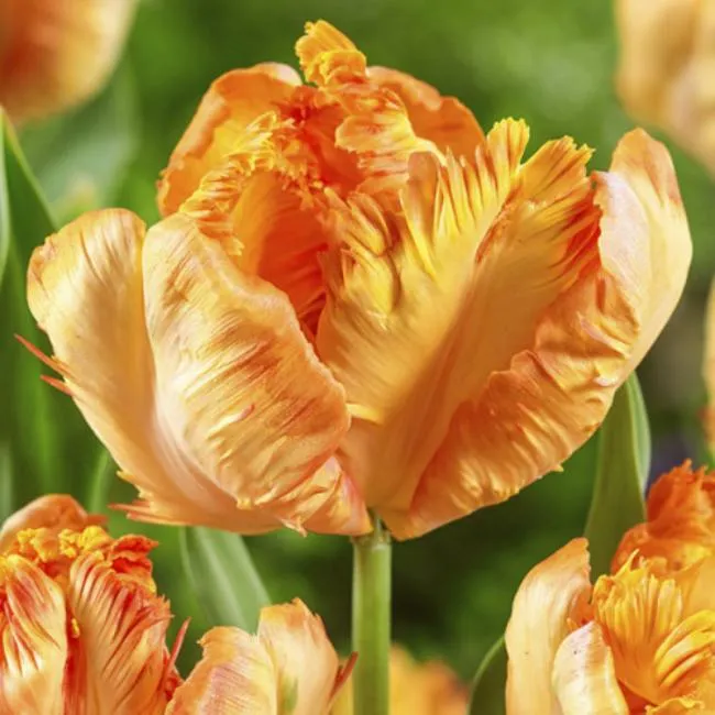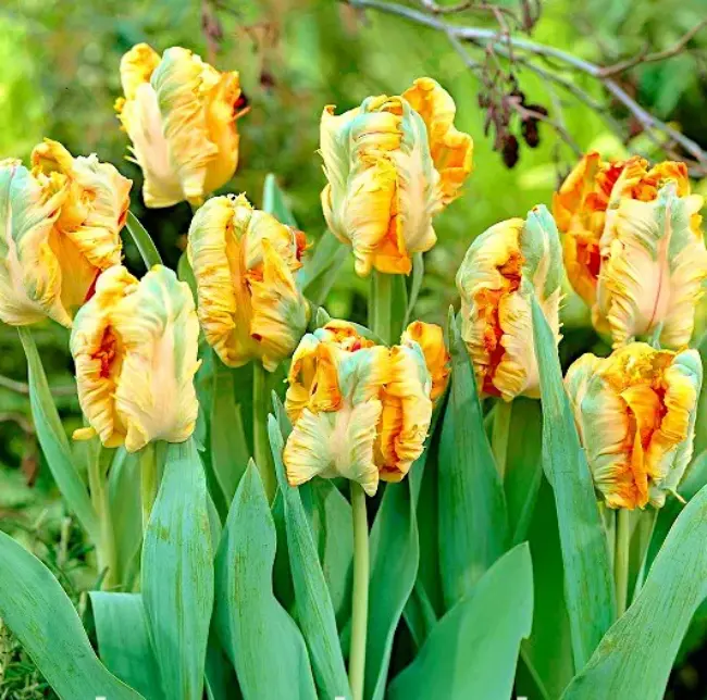 Тюльпаны Пэррот Кинг являются одним из самых красивых сортов. Этот сорт был выведен в Нидерландах и относится к классу Попугайных. Растения имеют крупные, бокаловидные и гофрированные цветки жёлто-алого цвета с яркими всплесками зелёного по спинке лепестка. Высота цветка составляет около 9 см, а диаметр – 15 см.