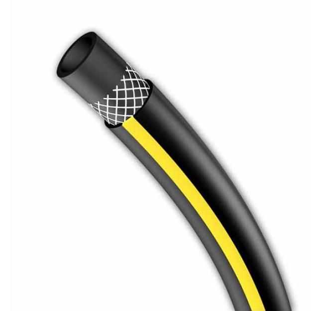 III слой – наружный, изготовленный из мягкого ПВХ черного цвета с двумя желтыми полосками. Предохраняет шланг от стирания.
