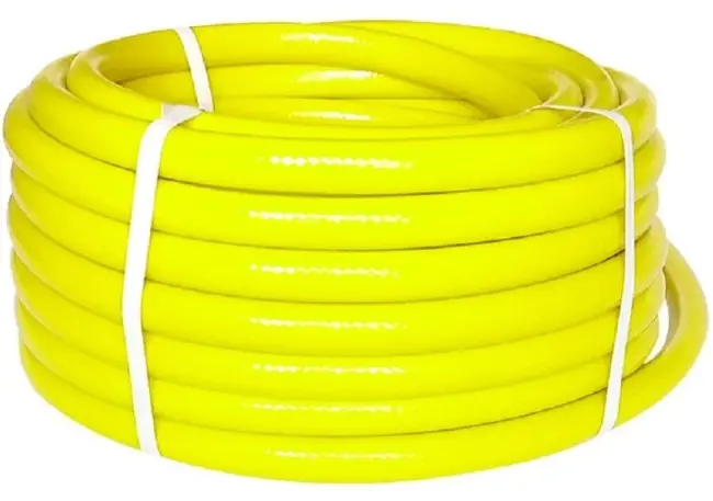 Армированный трехслойный поливочный шланг ПВХ. Стандартный поливочный шланг с сетчатой оплеткой, устойчив к УФ, не трескается, не истирается. Цвет - желтый. Внутренний диаметр 5/8" (15мм) - самый популярный. Рабочее давление 8 бар, этого достаточно для подключения к водопроводу или насосу. Нижний слой - черный ПВХ, верхний слой - желтый ПВХ, между ними сетчатая оплетка из полиэфирных нитей.