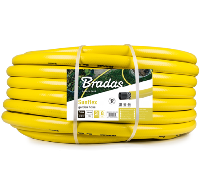 SUNFLEX - трехслойный армированный садовый шланг для полива и орошения. Поливочный шланг SUNFLEX год за годом берет пальму первенства, как самый популярный среди потребителей поливочный шланг. Его привлекательный яркий цвет и соотношение цена/качество – не могут остаться незамеченными.