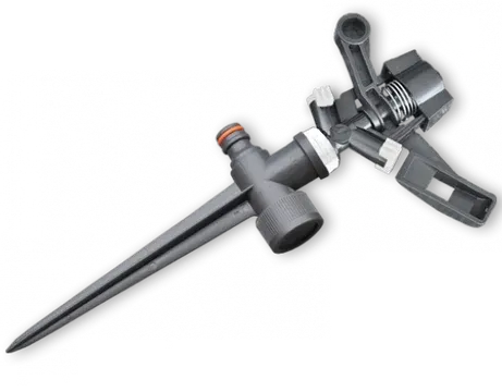 Пластмассовый пульсирующий ороситель с колком для втыкания в землю. Стандартный штуцер для быстросоединителей, резьба с возможностью последовательного соединения нескольких разбрызгивателей. Пространство орошения 17m.