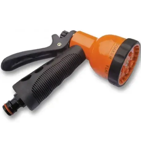 Поливочный пистолет из пластмассы с обрезиненной ручкой. Имеет 6 вариантов полива: конус, струя, узкий душ, полный душ, плоский, туман. Регулируемый рычаг подачи воды с фиксатором в нажатом положении. Стандартный штуцер для быстросъема.