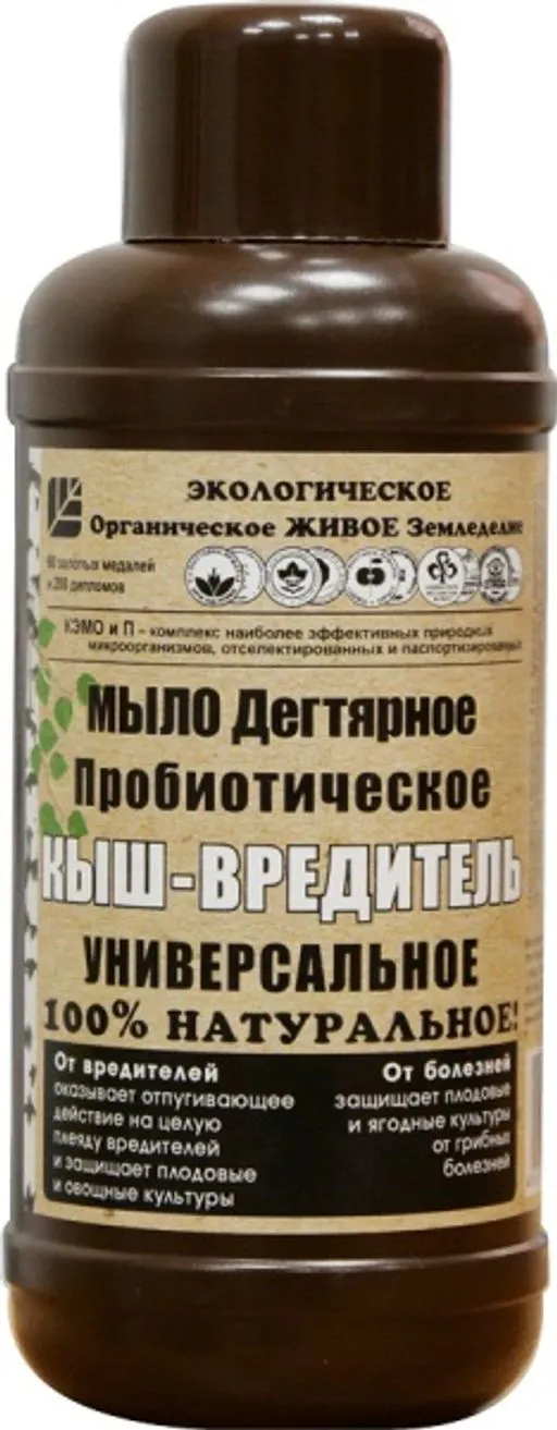 Мыло применяется для профилактики болезней растений и эффективной борьбы с вредителями садовых участков. Предупреждает, уничтожает и отпугивает целую плеяду вредителей: тля, клещи, бабочки, жуки и даже грызуны. Мыло представляет собой густую коричневую жидкую смесь, основными ингредиентом которой являются калийные соли жирных кислот, березовый деготь и полезные природные бактерии – пробиотики. Для производства мыла используются только натуральные ингредиенты.