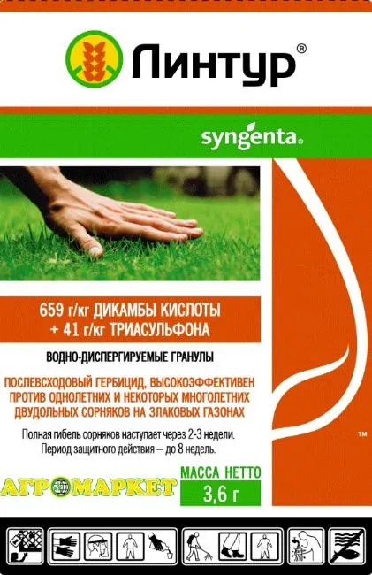Средство от сорняков Линтур 70% ВДГ - послевсходовый комбинированный гербицид для применения на посевах злаковых и газонных трав. Имеет два действующих вещества: дикамбу и триасульфурон. Дикамба является росторегулятором, а триасульфурон ингибирует синтез незаменимых аминокислот. Оба действующих вещества проникают через корневую систему и листья сорняков. Результатом воздействия является остановка роста, пожелтение и некроз листьев и стеблей с последующей гибелью сорняков. Симптомы появляются на 5–7-й день, а полная гибель наступает через 2–3 недели после обработки, в зависимости от вида сорняков и погодных условий.