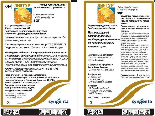 Максимальные дозы вносят при преобладании трудноискоренимых сорняков, либо при переросших сорных растениях. На озимых зерновых культурах для дополнительного контроля злаковых сорняков рекомендуется вносить ЛИНТУР (150-180 г/га) в смеси с препаратом БОКСЕР (1,0 л/га) до фазы кущения.