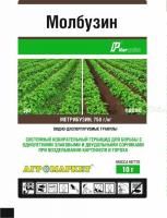 Механизм действия: при довсходовом применении Молбузин уничтожает сорняки в момент прорастания; при обработке вегетирующих сорняков действие препарата проявляется через 3-7 суток, гибель происходит через 10-15 суток.