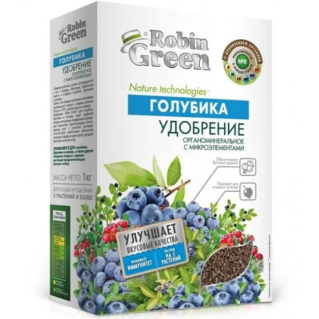 Удобрение сухое Робин Грин органоминеральное для голубики является сбалансированной подкормкой, использующейся при выращивании голубики. Комплексная добавка отличается увеличиванием сахаристости плодов, развития сильных кустов и обильного плодоношения. Подкормка улучшает структуру и плодородие почвы, повышает вкусовые качества урожая, а также увеличивает сроки его сохранности. Питательное удобрение сформировано в гранулу. Таким образом, органоминеральные частицы предотвращают вымывание из почты и способствуют более длительной отдаче полезных элементов.