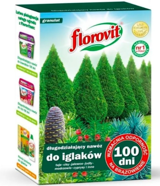 Удобрение Флоровит для хвойных длительного действия 100 дней - это высококачественное комплексное минеральное удобрение для сада, огорода, дачи, длительного действия, подходящее для всех видов хвойных в одиночных и групповых посадках. Средство пролонгированного действия используется как для новых насаждений, так и для многолетних растений.Дополнительное содержание магния в составе для садовых деревьев обеспечивает: здоровый рост;устойчивость к потемнению игл;интенсивный окрас;равномерное питание растений. Гранулы стимулируют рост, понижают уровень стресса, усиливают декоративность роста елей, сосен, туи, пихты, можжевельника, кедра, кипариса, тиса, лиственницы.Способ применения в садоводстве: смешайте питательную добавку для хвойных растений с грунтом/субстратом для повышения эффективности. При посеве саженцев необходимо внести в лунку гранулы в соответствии с нормами внесения. Кроме того, рекомендуется периодическая подкормка хвойных растений для поддержания их внешнего вида.Подкармливайте елку в апреле, в середине июня и в середине августа.Рекомендуется смешать с верхним слоем почвы. При использовании мульчирующих материалов (кора, древесная щепа, опилки, гравий, песок) рекомендуемая доза должна быть размещена в нескольких местах под поверхностью подстилки с равными интервалами и дозами. Эффективность оплодотворения увеличивается при регулярном поливе.Применение: 25-35 г/м 2 или 15-25 г/растение.Дополнительное внесение: 45-60 г/м 2 или 25-45 г/растение в зависимости от возраста и размера растений.Состав: Удобрение NPK (Mg0) 15,0 - 7,0 - 16,0 (4,0) содержит карбамидформ с железом. Состав удобрения: 15,0% - (N) общий азот;7,7% - (N) амидный азот;2,8% (N) - нитратный азот;4,5% - (N) азот карбамидформ, в котором 0,6 % - (N) азот карбамидформ, растворимый только в горячей воде;3,2% - (N) азот карбамидформ, растворимый в холодной воде;7,0% - (P,0.) оксид фосфора (V), растворимый в нейтральном растворе цитрата аммония и воде;4,6% - (P,0.) оксид фосфора (V), растворимый в воде;16,0% - (К,0) оксид кальция, растворимый в воде;4,0% - (Mg0) суммарное содержание оксида магния;0,3% - (Fe) суммарное содержание железа.Дополнительное содержание магния поддерживает устойчивость растений к пожелтению в течение всего периода вегетации.Постепенное выделение питательных веществ гарантирует оптимальное питание растений день за днем в течение 100 дней.Срок внесения: апрель, июнь, август.