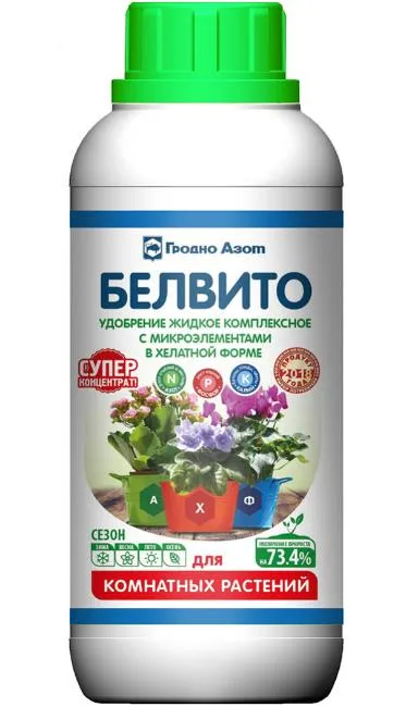 Для подкормки комнатных растений.Способствует увеличению прироста растений на 73,4 %, повышению декоративности (насыщенная окраска листьев). Действующие вещества: Азот – 3,1-3,8 % масс.; калий – 3,8-4,5 % масс., фосфор – 0,8-1,2 % масс., магний – 0,55-0,75 % масс., микроэлементы (железо, марганец, цинк, кобальт, медь, молибден, бор). Препаративная форма: Водный раствор. Срок годности не ограничен. Номинальный объем 435 мл.