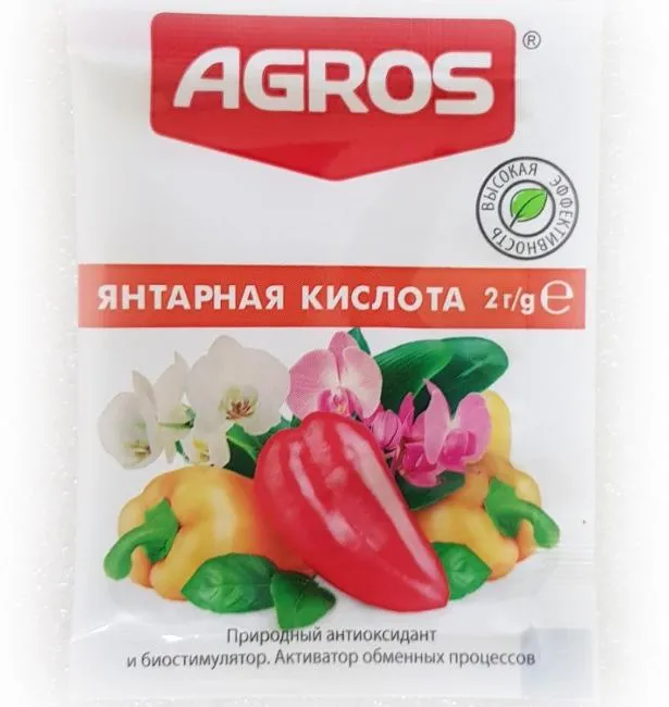 Доступный и безопасный препарат стимулирующий рост растений. Использовать янтарную кислоту можно для улучшения прорастания семян, ускорения укоренения черенков, стимуляции корневой системы, снятия стресса растения, подталкивания для роста и цветения. Янтарная кислота не ядовита, не токсична для окружающей среды, поэтому её можно использовать дома и в огороде без защитных средств. Ускоряет рост и развитие растений, повышает их устойчивость к засухе, холоду, недостаточной освещенности. Снижает заболеваемость, повышает урожайность, улучшает качество плодов.