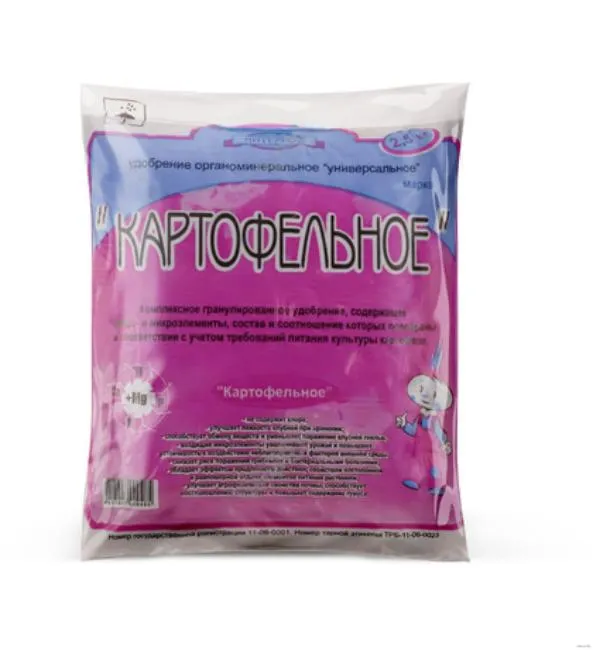Органоминеральное комплексное удобрение, в котором состав и соотношение макро и микроэлементов подобраны в соответствии с потребностью в питании картофеля.Применяют для улучшения цветения и плодоношения, повышения качества клубней. Обеспечивает высокий урожай с отличными вкусовыми качествами, отсутствие в плодах нитратов, улучшают лёжкость клубней.Элементы питания в органической оболочке усваиваются на 80-90.Микробиологическая добавка улучшает структуру почвы.Гуминовые вещества – природные стимуляторы, способствуют активному развитию клубней.