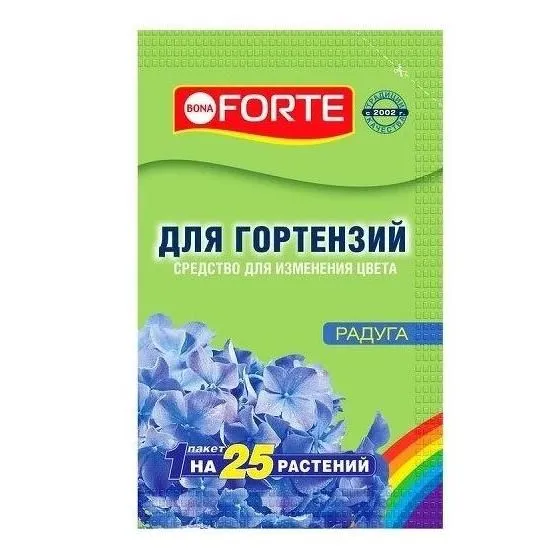 Изменяет цвет цветущих гортензий с розового на голубой, поддерживает яркий насыщенный голубой цвет соцветий, улучшает внешний вид крупнолистных гортензий. Используя разные сорта и меняя цвет гортензий можно создавать цветные фантазийные клумбы.