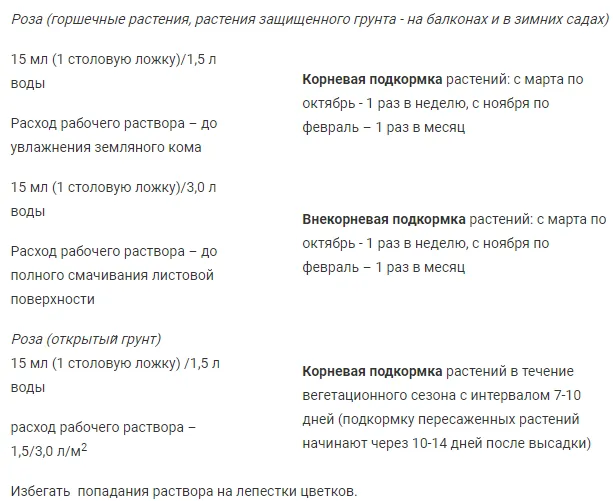 Перед применением удобрение взболтать. Удобрение развести в воде комнатной температуры в соответствии с регламентами применения. Полученным рабочим раствором подкармливать растения, чередуя корневые и внекорневые подкормки: применять оба вида подкормок в период (неделя, месяц), указанный в таблице.