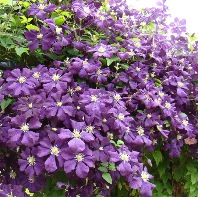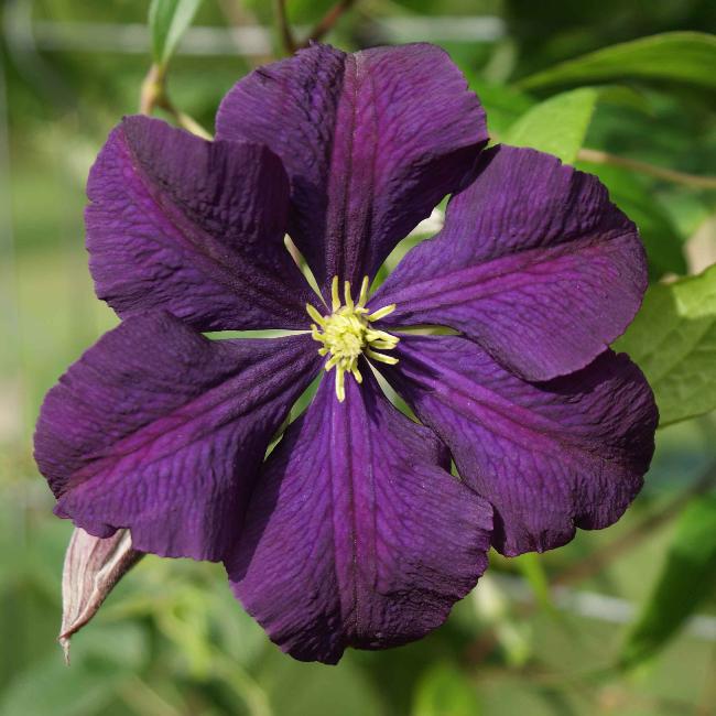 Крупноцветковый клематис формирует раскрытые, звездчатой формы цветы, достигающие в диаметре 12-15 см. Окрас лепестков – фиолетовый, отливающий пурпурными бликами. На лепестках хорошо просматривается более темная тонкая полоса. Кремового цвета тычинки с золотистой пыльцой придают насыщенной расцветке нежность и свежесть, благодаря чему цветущая лиана выглядит очень привлекательно.