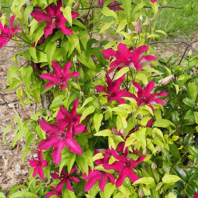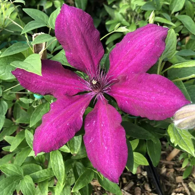 Клематис Рутель относится к группе позднецветущих клематисов и обладает обильным цветением на молодых побегах. Его цветение начинается с конца июля и продолжается до сентября. Цветки этого сорта имеют форму звезды диаметром 12-14 см и бархатистую текстуру. Они окрашены в ярко-пурпурный цвет, тычинки имеют пурпурную окраску.