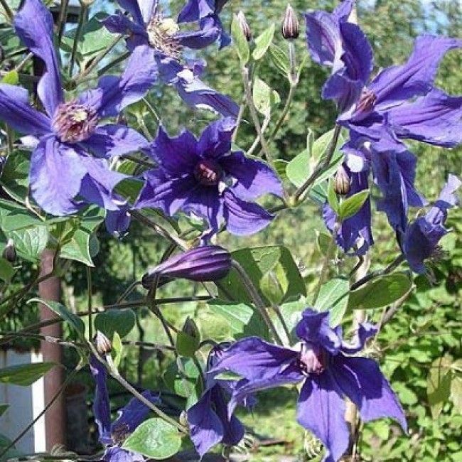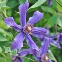 Растение формирует полупониклые, а затем раскрытые крупные цветки диаметром 11 см на побегах текущего года. Простой цветок состоит из узких закрученных лепестков, широко раскинутых в разные стороны и окрашенных в фиолетово-голубые оттенки. Пыльники окрашены в пурпурно-серый цвет.