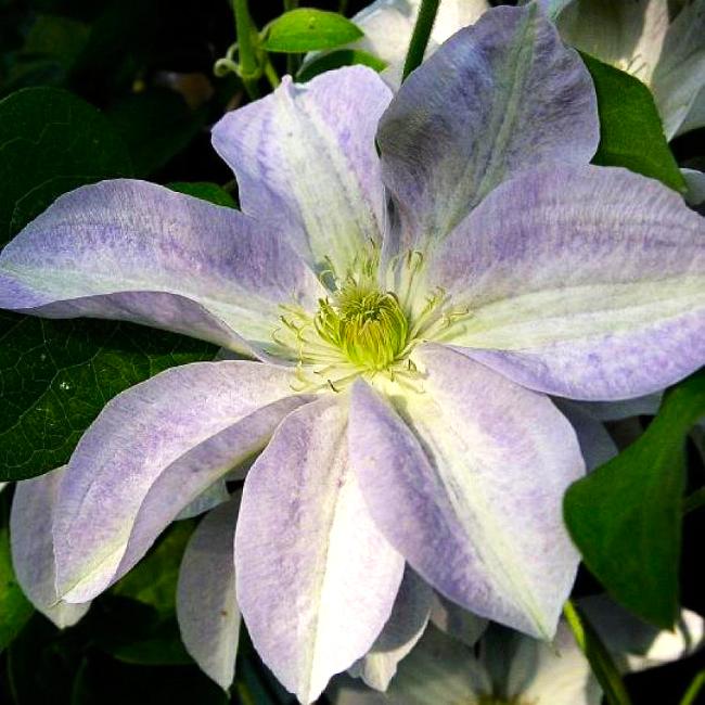 Обозреваемый сорт клематиса характеризуется довольно крупными цветками, средний диаметр которых варьируется от 7 до 12 см при количестве лепестков в 6 ед. Необходимо обратить внимание на немахровую структуру и преобладающий белый оттенок с нежными лавандовыми вкраплениями. Основные тычинки представлены в желтовато-зеленом цвете.